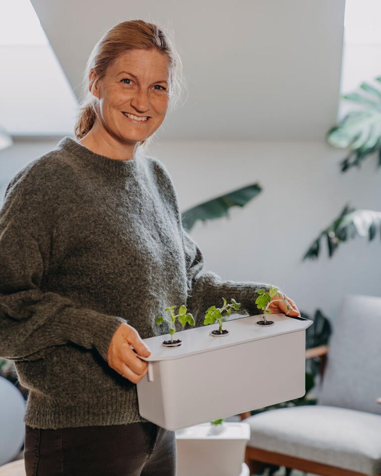 Mitt beste tips for å lykkes med å dyrke i Harvy er å plassere den lyst. I sommerhalvåret står den sydvent og fra september til mars bruker jeg plantelys. En lyskilde er livsviktig for å få god vekst med kraftige, sunne planter og et vellykket resultat. Med et sugekoppstativ kan du justere lyset i takt med plantenes vekst. En god huskeregel er å ha belysningen ca. 10 cm over plantene. Og det er med plantene som oss mennesker, vi har godt av hvile om natten. Derfor slår jeg av lampen på natten, slik at plantene får cirka åtte timers hvile. Her kan du også bruke en timer. Når jeg sår salat og krydderplanter pleier jeg å bruke cirka tre frø i plantepluggen. Det å kunne høste store og ferske blader av salat og krydder gjennom hele året synes jeg er helt fantastisk.