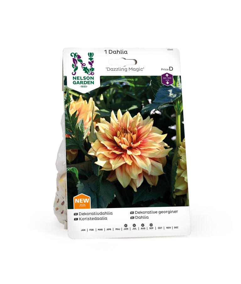 Vakker georgine som skifter farge fra rød til oransje og gul. En herlig fargekombinasjon i sensommerbuketten med sine vakre fargeskiftninger og solide stilker.