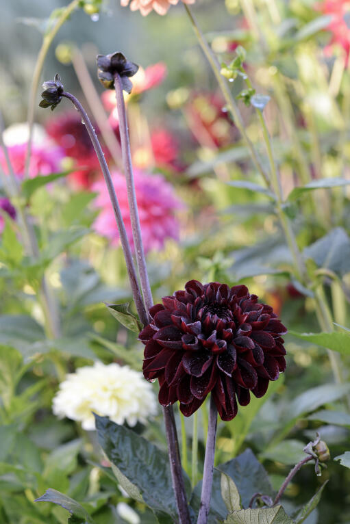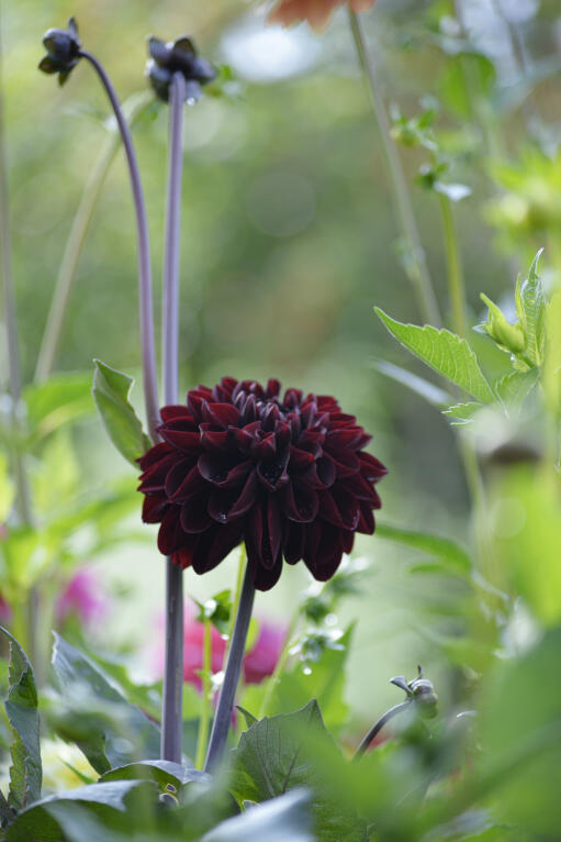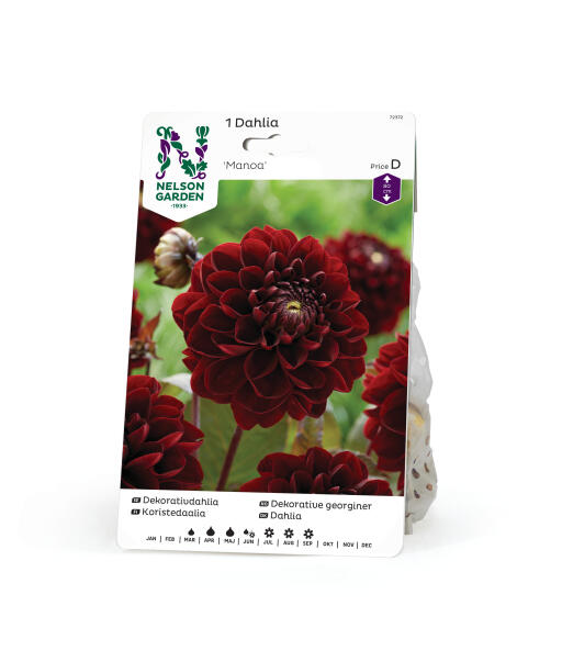 Praktfull dekorativ georgine i dyp mørkerød farge. Perfekt som blikkfang i et bed eller en bukett med rust- og aprikosfargede toner. På kraftige mørke stilker står den fint i bedet og blir en flott snittblomst.