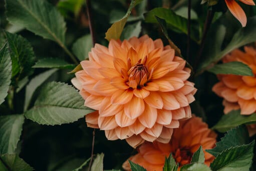 Høy, aprikosfarget Pink Magic-georgine, med gule innslag i midten av den store blomsten. Fargen er perfekt i kombinasjon med med blomster i rustfarger, og litt "skitne" farger. Fin i bed og potte på balkongen.