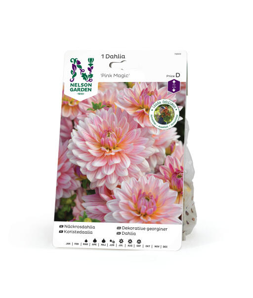 En søt og litt lavere dekorativ georgine som blomstrer lenge på stødige stengler. De mykt avrundede kronbladene har en søt rosa grunntone, gul base, og forseggjorte mørkerosa striper. Magisk i potte, bed, og vase.