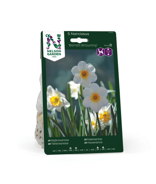 'Barrett Browning' er en edelnarsiss som tilhører Den småkronede gruppen. Denne sorten har hvite kalkblader og en bikrone som er kraftig oransje. Anses som mindre appetittlig for rådyr, hare, kanin og markmus.