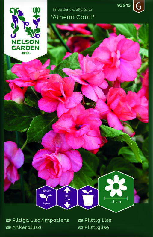 Riktblomstrende skjønnhet med store, vakre halvdoble og doble korallfargede blomster. En ekte kjempe som er villig til å blomstre selv i skyggefulle omgivelser. Planten tåler en regnfull og kald sommer, men må tas inn før første frost. Fin potteplante. Trives i godt gjødslet løs jord, vann rikelig. Topp plantene for at de skal bli kraftige.