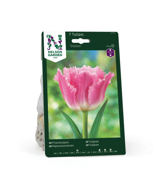 Kronbladene er vakker rosa med hvit base , og de noe lysere frynsete kantene ser nesten ut som blonder. Et par 'Dallas' i den rosa buketten blir virkelig prikken over ien. En fantastisk snittblomst som holder seg lenge.