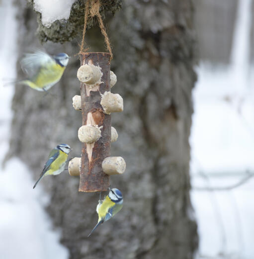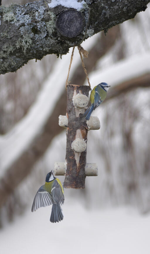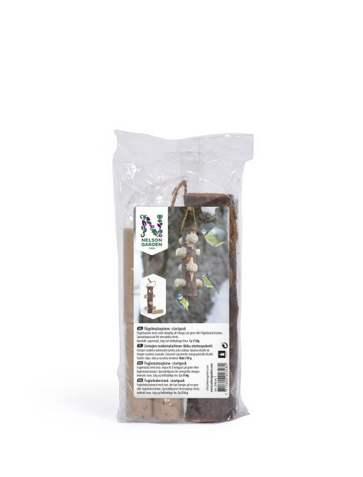 Fuglematar med snor, eigna til å hengjast på grein eller fuglematarstasjon. Spesialtilpassa for energirike stenger.
