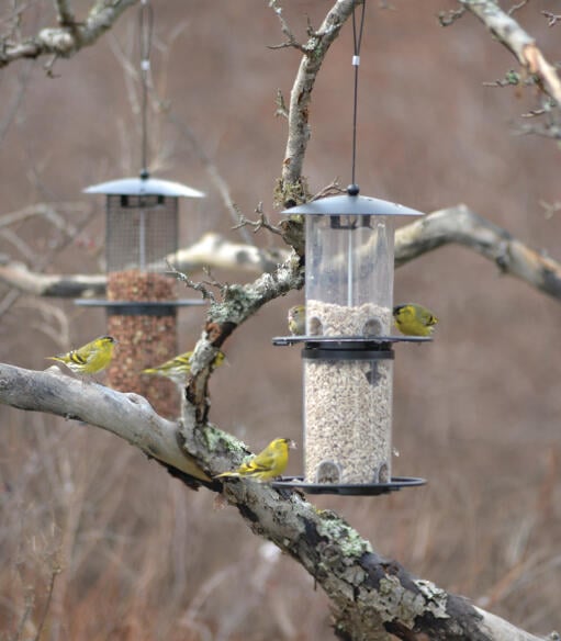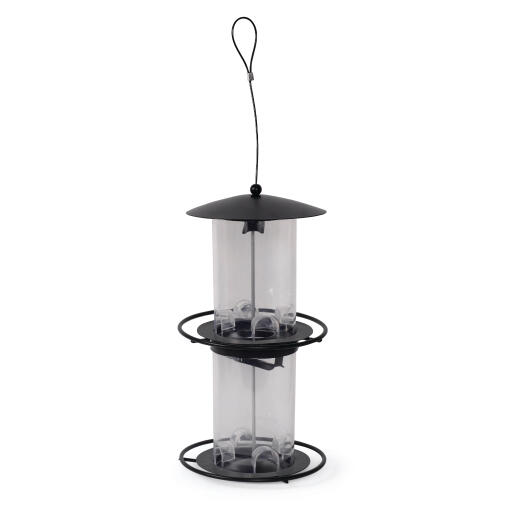 Tradisjonell fuglemater for fuglefrø med 8 fôruttak og 2 metallringer der fuglene kan sitte. Beholder i polystyren, øvrige deler av svart metall. Vaier og karabinkrok inkludert. H 35 cm, Ø 18 cm.
