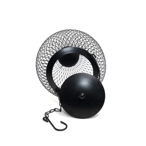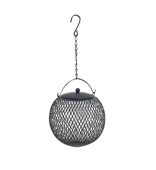 Fuglemater for nøtter i svart metall. Dekorativ rund form. Utstyrt med lokk, metallbøyle, og kjede med krok. H 25 cm Ø 15 cm