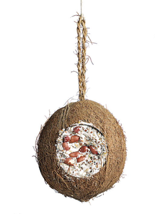 Uthulet hel kokosnøtt med tre hull, fylt med energirik mat av fett, korn og frø. Perfekt for fôring av villfugler på plasser uten daglig tilsyn. Ca. 700 g.