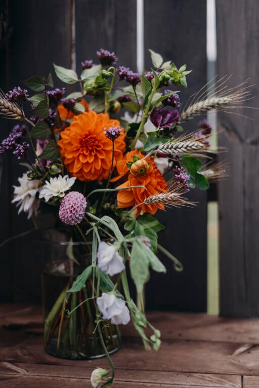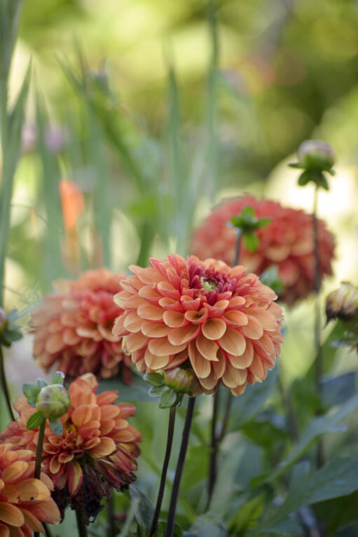 En søt georgine der solnedgangens brennende farger - gult, oransje og teglsteinsrødt - samles på kronbladenes frem- og bakside. Den fylte blomsten minner om en pompomgeorgine, og den første etterfølges av mange flere.