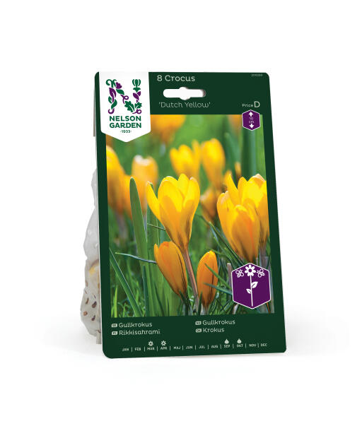Gullkrokusen 'Dutch Yellow' har relativt store, herlig smørblomstgule blomster med smale fiolette striper på de ytre kronbladene. I tillegg til i bedet passer den fint i kanten av busker og hekker, og foran trær der vårsolen lyser.