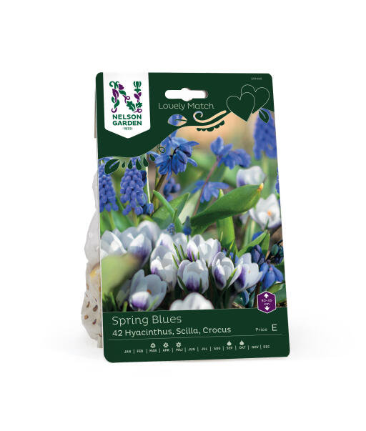 En stolt perleblomst, en krusete sibirblåstjerne, og en krokus med myke former. Det blir en virkelig søt vårbukett i blått og hvitt med innslag av fiolett. Passer til blomsterbedkant, korg og potte, og også i den første lille vasen om våren.