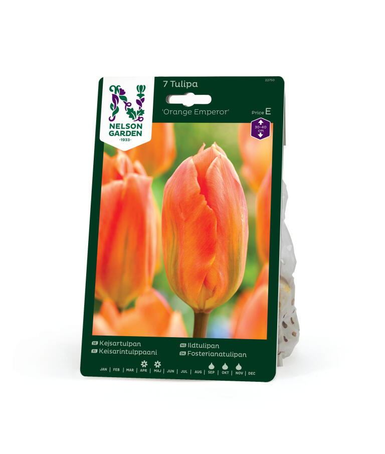 De store, avlange blomstene til 'Orange Emperor' er lysende gulrotrøde med gul basis. Passer også blant busker, i tillegg til i bedet. Sorten tilhører Fosteriana-gruppen og kan få et langt liv i hagen. Meget fin som snittblomst.
