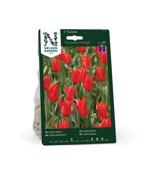 Som en egen sol i hagen stråler denne oransje liljeblomstrende tulipanen, der de gule kantene på kronbladene gir et spesielt skimmer! De er sentblomstrende, og i år da våren er kjølig, kan de blomstre langt ut i juni. Meget fin som snittblomst.