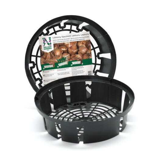 Legg løkkurven i jorden og plant løkene i den. Det er enkelt å grave opp kurven med løk og flytte dem/oppbevare dem.