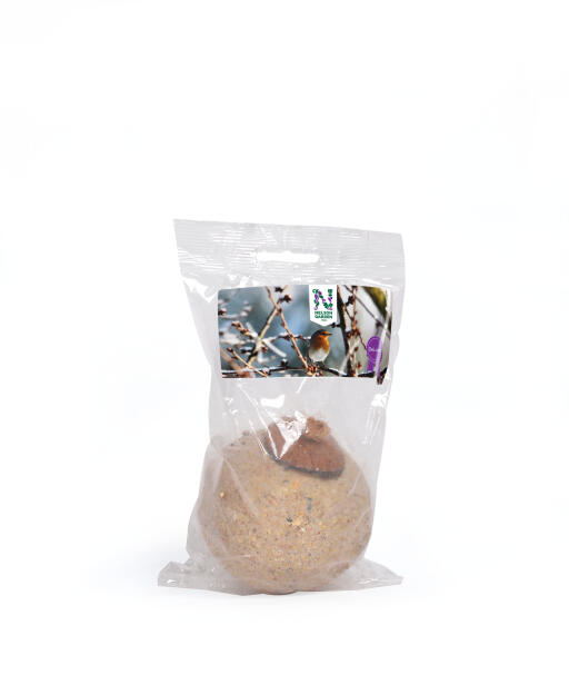 Stor meisebolle uten nett til foring av villfugl. Festet på en kokosplate med snor og kan henges på gren eller fuglematerstasjon. Energirikt innhold av fettholdige frø, talg og korn. 500 g
