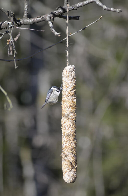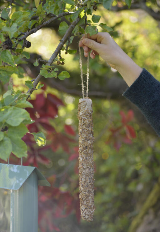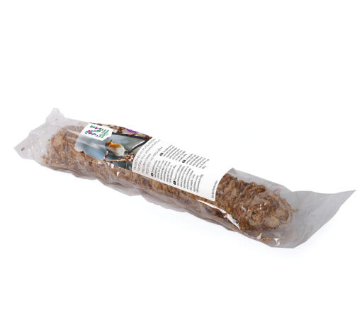 Energirik mat med melormer, korn og frø. Fett- og proteinrik fuglemat som er bakt rundt en komposterbar pinne. Klar til å henges opp i sitt snøre. Et 100% naturprodukt. 400g.