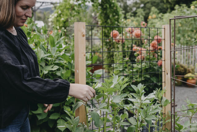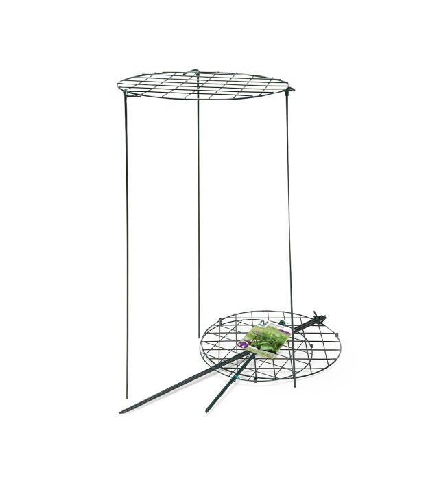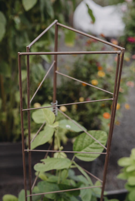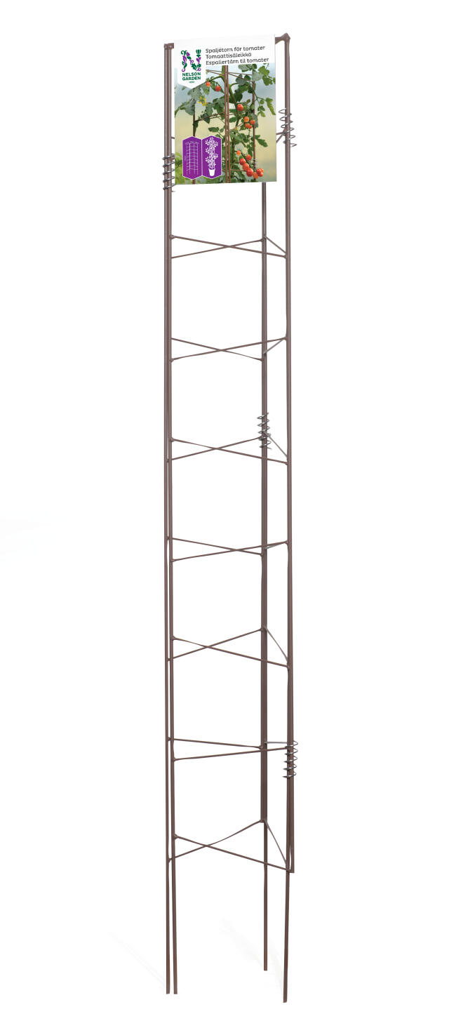 Smart plantestøtte til høye planter, først og fremst tomat og agurk. En tredelt epalier som plasseres rundt planten som et stødig tårn. Av pulverlakkert stål, rødbrun. Høyde 140 cm, bredde 23 + 25 + 23 cm.