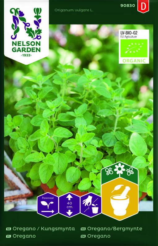 Økologisk frø. Oregano er en aromatisk krydderplante som blomstrer med blå blomster. Høst bladene etter hvert og bruk dem ferske eller høst hele kvister for tørking. Herlig krydder over tomater og fetaost.