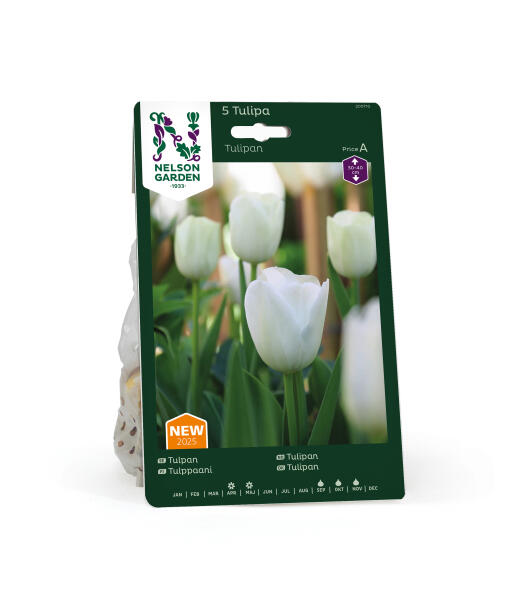 En klassisk og diskré hvit tulipan på stabil stilk og med en enkel, vakker blomsterform. Blomstene er relativt store, hvite og står lenge. Vakker også som snittblomst i buketter.