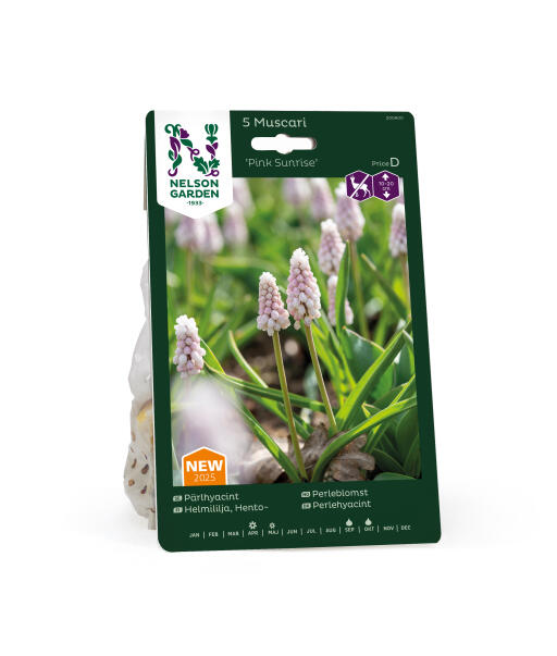 Unik lyserosa prisbelønt perleblomst som da den ble lansert, ble hyllet av Royal Horticultural Society. Blomstene er kompakte med lyserosa blomsterklaser som blir nesten hvite i toppen. Elsket av humler, bier og sommerfugler fordi de er fulle av nektar tidlig på våren.