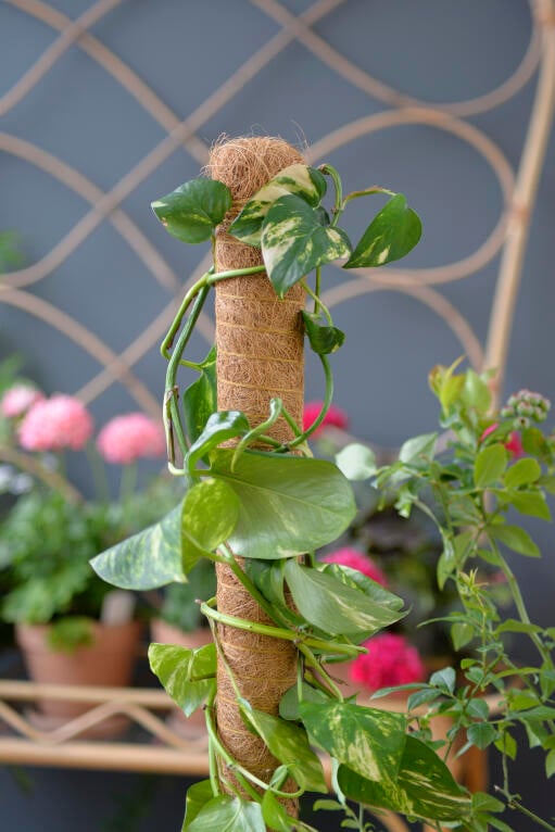 Plantestøtte av naturmaterial, tre kledd med kokosfiber. Pent og praktisk til klatrende inneplanter som for eksempel gullranke og monstera.