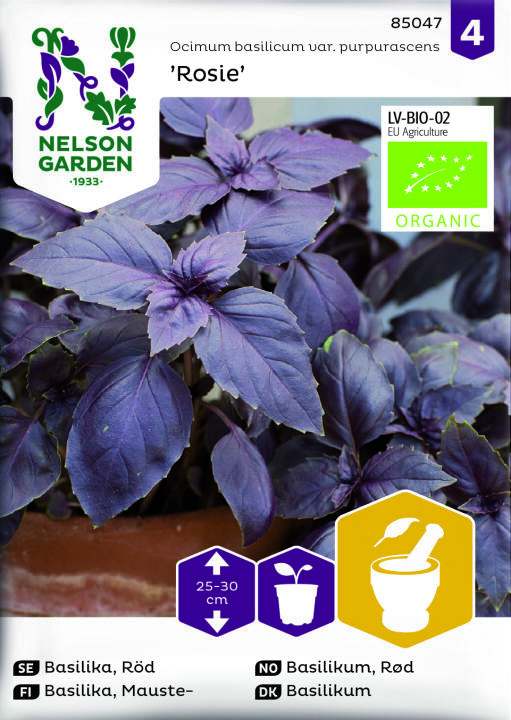 Økologiske frø. En svært dekorativ rød basilikum som elsker varme. Plant gjerne basilikum i en potte på en varm og solfylt plass. Bladene som høstes etter hvert passer utmerket i en rød pesto eller sammen med tomater og revet parmesan.