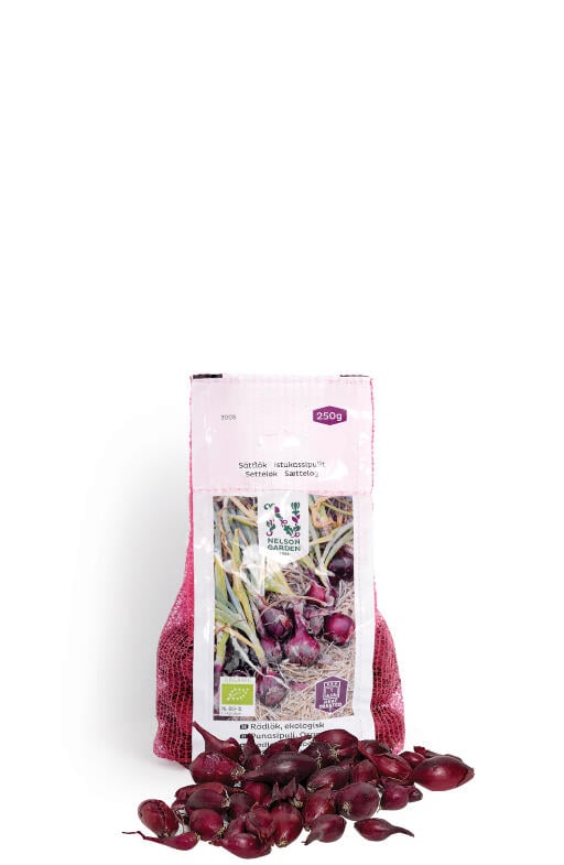 Økologisk dyrket setteløk. Rødløk er lettdyrket og litt mildere i smaken enn gul løk. Den passer derfor utmerket rå i f.eks. salater der den også er dekorativ. Varmebehandlet for en sikrere avling.