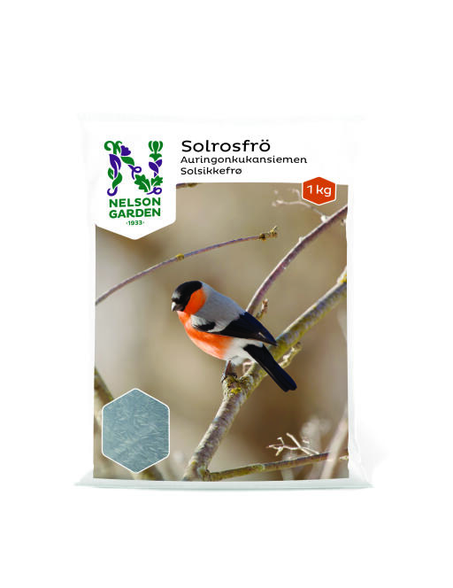 Frø for foring av villfugler. Solsikkefrø er veldig energirike och en spesiell favoritt for mange småfugler. Pose