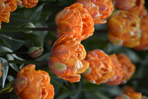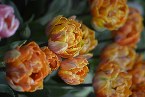 To ganger prisbelønnet skjønnhet som beholder litt av knoppens grønne farge etter den åpner sine lag av oransje kronblader. En velfylt og duftende, pionlignende tulipan med rødfiolette striper på de ytterste kronbladene. Passer utmerket i potte.