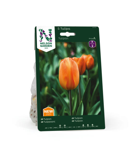 En klassisk oransje tulipan på solid stilk og med en enkel, vakker blomsterform. Blomstene er relativt store, knalloransje og står lenge. Vakker også som snittblomst i buketter.
