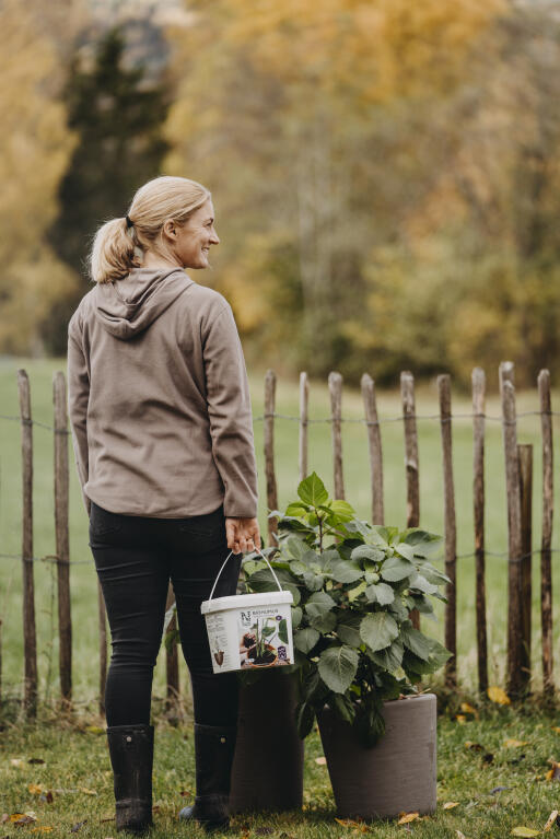 • Legg et 2 cm tykt lag på jorden og bland det lett ned rundt plantene Ved planting i potte, bland 20 % Biohumus med plantejorden