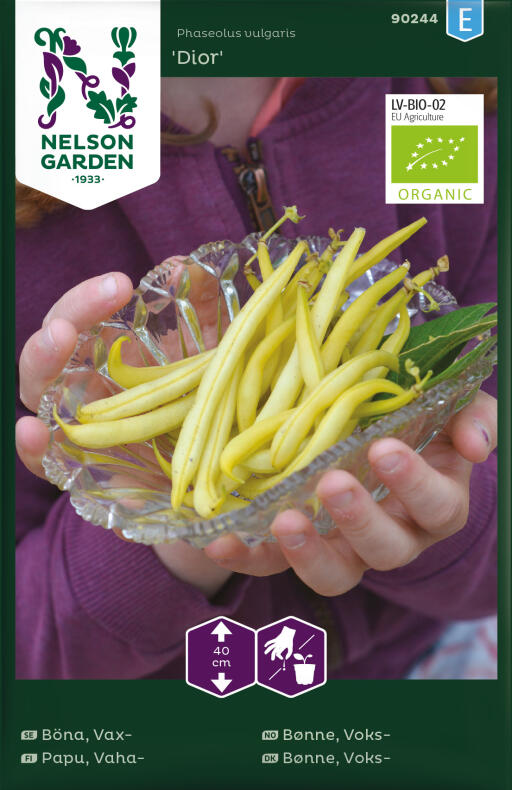 Økologiske frø. Velsmakende voksbønne der de fleste belgene vokser ovenfor bladverket, og gjør dem meget lettplukket. Høstes ofte, etter behov. Gode å kokes og spises med smør.